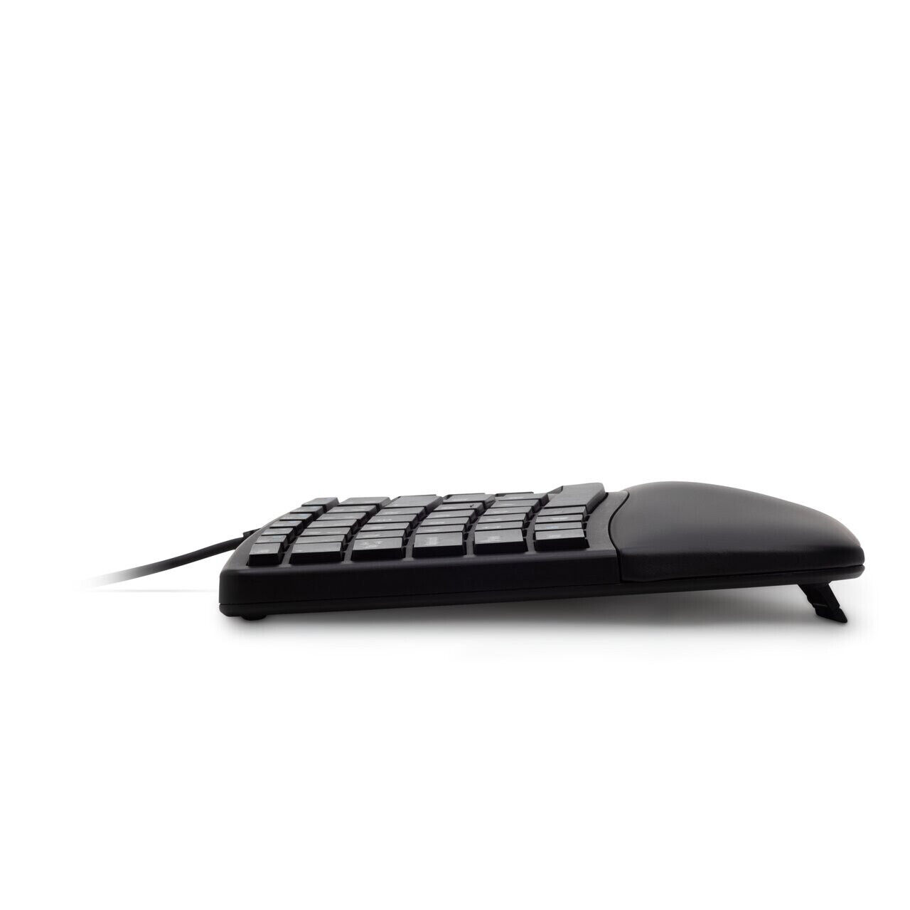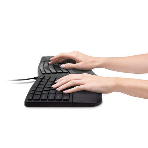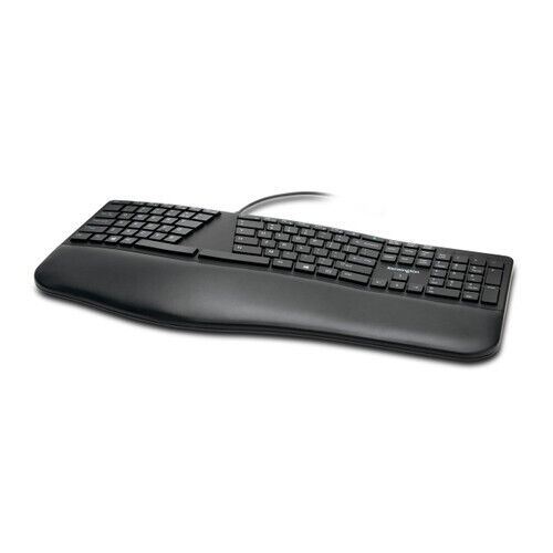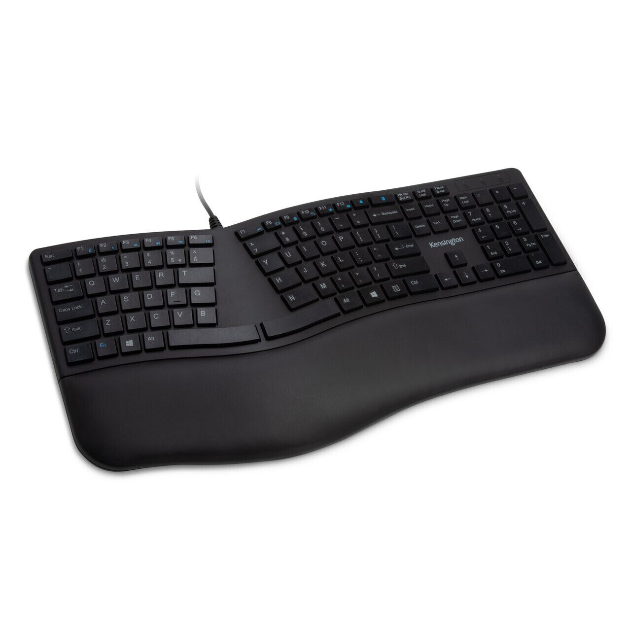 With its split and sloped keyboard with adjustable reverse tilt, and a built-in cushioned wrist rest, the ergonomist-approved Pro Fit® Ergo Wired Keyboard positions your hands for improved comfort. Features include quiet typing; spill-proof keys; F-keys for shortcuts; caps lock, numbers lock, and scroll lock; and a plug & play USB connection.