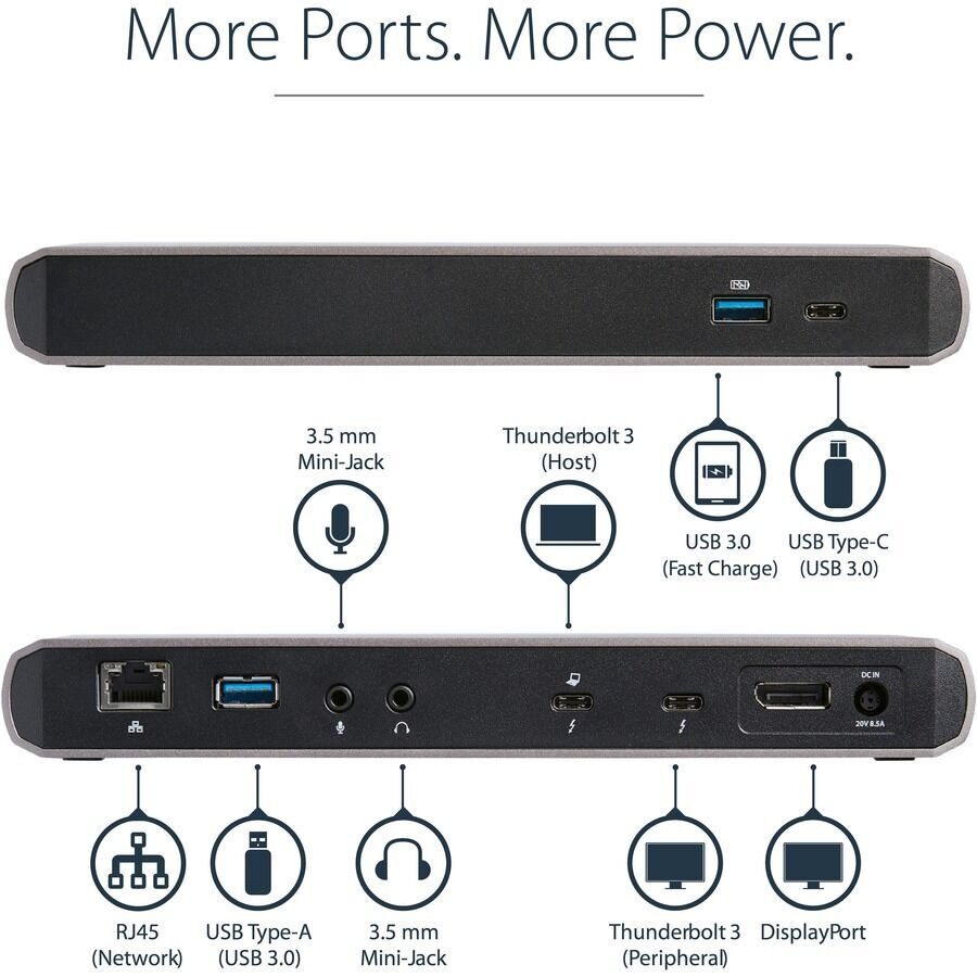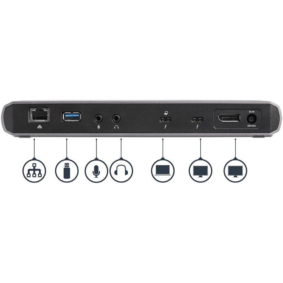 StarTech.com Thunderbolt 3 Docking Station for Notebook - 85 W - Black, Grey - Certified Thunderbolt 3 docking station with dual monitor 4K 60Hz DisplayPort + TB3 (USB-C), 85W Power Delivery, 2x USB-A, 1x USB-C, GbE, audio - Macbook Pro / Air, macOS, Windows - Incl. TB3 cable, USB-C to DP adapter - Daisychain TB3 devices